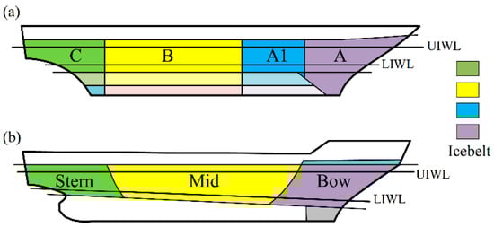 Ice belt division in design rules: (a) RMRS rules; (b) DNV rules.