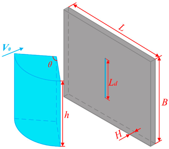 In Equations (8)–(10), wc is the plastic deformation at the center of the plate and Ld is the length of the middle plastic hinge line. For the wedge-shaped-rigid-mass impact, the hinge line length Ld is equal to the impactor height h. However, for the ice floe impact, the ice body will experience deformation and damage during the impact process. The length of the middle plastic hinge line is smaller than the ice thickness h, since the top and bottom tips of the wedge-shaped ice body are prone to breaking during impact. Therefore, a damage coefficient ω is defined to consider the influence of ice damage along the height direction, and Ld = ωh. The value range of ω is 0.6~0.75. η2 and γ are the intermediate values in the calculation process.