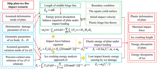 According to the above analysis, considering the dissipated energy of the ice damage and the elastic effect of the ship plate, by combining Equation (1) we can determine that the net impact energy fully transformed into the plastic-strain energy of the ship plate is