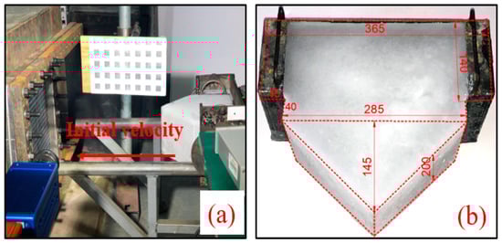 (a) Experimental set-up of ice–plate impact and (b) ice sample geometry dimensions (unit: mm) [28].