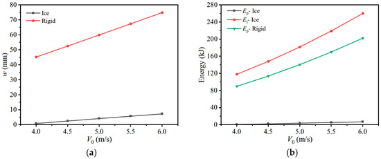 Figure 8 shows the plastic deformation and energy absorption under ice impact and rigid-mass impact conditions. From Figure 8a, the plastic deformation of the plate under ice/rigid impact increases approximately linearly with the increase in velocity. It can be seen from Figure 8b that the energy absorbed by each part of the impact system increases with the increase in velocity. The plastic-strain energy of the ship plate under ice impact is much smaller than that under rigid-mass impact. This shows that during impact, the ice damage will absorb most of impact energy, so that a small part of the impact energy is absorbed by the ship plate by undergoing plastic deformation.