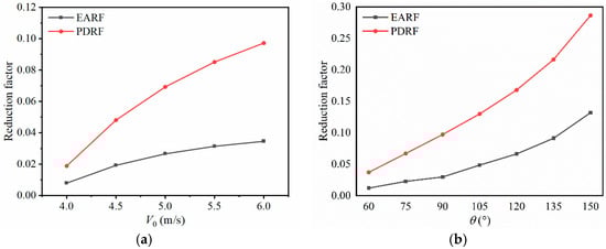 Reduction factor (EARF, PDRF) of the ship plate. (a) Relationship between the reduction factor and the impact velocity; (b) Relationship between the reduction factor and the front-end angle.