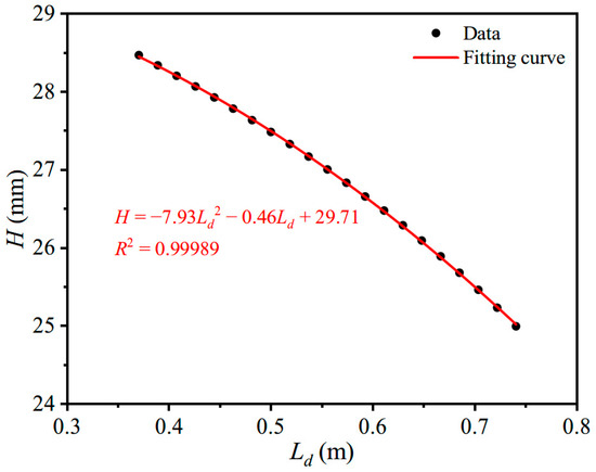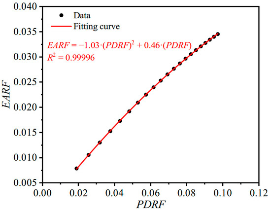 Figure 10 is the curve fitting the energy-reduction coefficient to the plastic deformation reduction factor, and it gives the fitting formula, . Combined with Equation (23) and Figure 10, EARF changes parabolically with the ratio of plastic deformation. The plastic-strain energy of the ship plate under ice impact can be estimated by the ratio of plastic deformation and the plastic-strain energy of the ship plate under rigid impact.