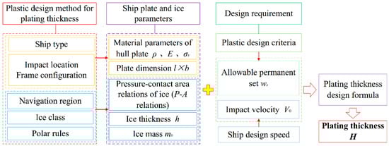 The design principles and the criteria guiding the design of ship structures have evolved over time. Initially, the elastic design method was used in ships’ structural design, as shown in Figure 11a. The design criteria in the elastic design method are the maximum allowable stress determined by the yield strength of the material and a defined safety factor. Using the elastic design method, the design dimensions of the structure will be too large, which makes the design’s weight heavier and increases the high cost of ship construction. The elastic theory applies in plate design only if the plate material does not yield. However, the load that causes the ship plate to yield does not represent the maximum load that the plate can withstand. The plate can withstand loads several times greater than the yield strength before failure or large deformation occurs [29]. For the safety of a ship’s strength structure, recognizing that a structure with small plastic deformation still has high structural strength means that it is acceptable for the ship to occasionally undergo small plastic deformation during navigation and operation in an icy region. Therefore, it is significant to develop the plastic design method based on a maximum allowable-permanent set. In the plastic design method, the determination of allowable-permanent-set criteria is related to the operability, reliability and safety of ship structures. Therefore, it is necessary to find the optimal critical value among structural operability, safety and construction cost and so on. The plastic design criteria of the ship’s structure is shown in Figure 11b. Based on the plastic design method, this paper proposes a plastic design formula for determining the preferred plating thickness under ice floe impact.