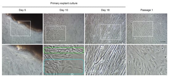 Representative pictures showing the cells derived from the primary explant culture of muscle tissues. The pictures below are enlarged ones of the white dotted boxes in the pictures above. The green dotted box indicates myotube-like cells and the sky-blue dotted box indicates fibroblast-like cells. Scale bars = 100 µm.