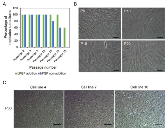 Establishment of cell lines from muscle tissues. (A) Effect of basic fibroblast growth factor (bFGF) on cell line establishment. The primary explant culture and subculture were performed in the presence or absence of bFGF. Only the cell lines cultured with bFGF were able to be subcultured beyond passage 25. (B) Representative pictures showing the morphology of cell lines until passage 20. The cell lines contained large numbers of flat fibroblast-like cells. Most cells had a single nucleus. Scale bars = 40 µm. (C) Morphology of three cell lines (designated as cell lines 4, 7, and 10) at passage 30. All three cell lines predominantly possessed fibroblast-like cells, but more epithelial cell-like cells were shown in cell lines 7 and 10 than in cell line 4. Scale bars = 200 µm.