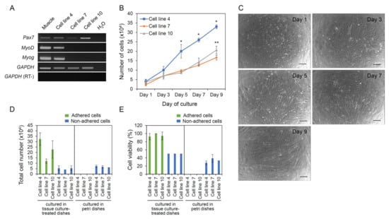 Characterization of the established cell lines. Three muscle-derived cell lines were characterized for their gene expression and growth characteristics. (A) Results of RT-PCR analysis for the expression of Pax7 specific for muscle satellite cells, MyoD specific for myoblasts, and Myog specific for myotubes. (B) Growth rate of the cell lines. (C) Representative pictures of cells growing for 9 days. Scale bars = 200 µm. (D,E) Anchorage dependency test of the cell lines. Three cell lines were individually cultured on either tissue culture-treated dishes or petri dishes for 7 days, and total cell number (D) and cell viability (E) were measured. The values for (B,D,E) are expressed as mean ± standard deviation of at least three independent experiments. *,** Asterisks indicate significant differences (p < 0.05).