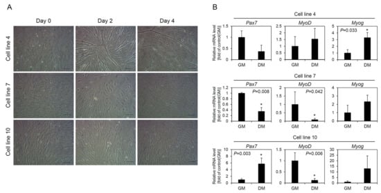 Differentiation of muscle-derived cell lines. For differentiation induction, three cell lines were cultured in growth medium (GM) for 3 days and then cultured in differentiation medium (DM) using low concentration of horse serum for 4 days. (A) Morphological observation of cells after culture in DM for 4 days. Myotube formation was observed only in cell line 4 and not in cell lines 7 and 10. Scale bars = 100 µm. (B) Changes in expression of Pax7, MyoD, and Myog genes after differentiation induction of the cell lines. The mRNA levels of the cells cultured in DM for 4 days were compared to those of the cells cultured in GM for 3 days before differentiation induction. Different gene expression patterns were observed for each cell line. The values are expressed as mean ± standard deviation of three independent experiments. * Asterisks indicate significant differences (p < 0.05).