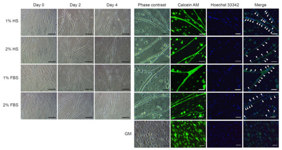 Morphological observation after differentiation induction of cell line 4 depending on different serum types and concentrations. For differentiation induction, cell line 4 was cultured in growth medium (GM) for 3 days and then cultured in differentiation media containing 1% or 2% of horse serum (HS) or fetal bovine serum (FBS) for 4 days. During differentiation induction, morphological changes of the cells were observed through a microscope and on day 4, multinucleation of myotubes was confirmed by live/dead and Hoechst 33342 staining. No significant difference was detected in morphological observation among treatment groups. Arrowheads indicate nuclei. Scale bars = 100 µm for day 0, day 2, and day 4; 40 µm for phase contrast, calcein AM, Hoechst 33342, and merge.