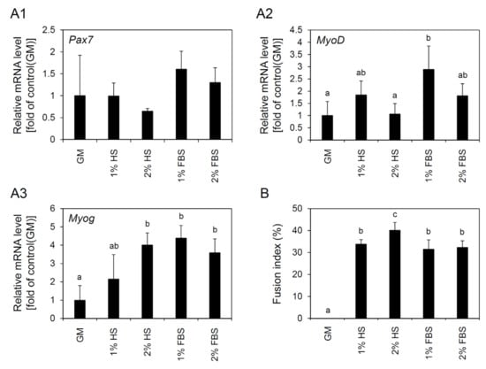Changes in gene expression and fusion index after differentiation induction of cell line 4 depending on different serum types and concentrations. For differentiation induction, cell line 4 was cultured in growth medium (GM) for 3 days and then cultured in differentiation media containing 1% or 2% of horse serum (HS) or fetal bovine serum (FBS) for 4 days. (A1–A3) Results of qRT-PCR analysis for the expression of Pax7 (A1), MyoD (A2), and Myog (A3) genes depending on differentiation conditions. No significant difference in Pax7 expression was observed among treatment groups. In contrast, expression levels of MyoD and Myog were observed differently according to the differentiation conditions. (B) Fusion index depending on differentiation conditions. The highest fusion index among the groups was observed under the condition using 2% HS. The values are expressed as mean ± standard deviation of three independent experiments, and abc different letters indicate significant differences (p < 0.05).
