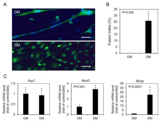 Differentiation of a muscle satellite cell line after long-term culture. A muscle satellite cell line at passage 128 was cultured in growth medium (GM) for 3 days and then cultured in differentiation medium (DM) for 4 days to induce differentiation. (A) Picture showing a multinucleated myotube. Cells were stained with live/dead and Hoechst 33342 staining. Scale bars = 40 µm. (B) Fusion index. (C) Relative mRNA levels of myogenic regulatory genes between before and after differentiation. The values are expressed as mean ± standard deviation of three independent experiments. * Asterisks indicate significant differences (p < 0.05).