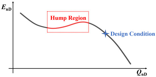 The abnormal phenomenon of a turning point on the pump head flow (flow coefficient QnD and energy coefficient EnD) curve, as shown in Figure 1, is referred to as the pump hump phenomenon. The region where the hump phenomenon occurs is known as the hump region or saddle region, according to some scholars. Currently, scholars worldwide generally agree that the hump phenomenon originates from changes in the flow state within the pump. However, there are two main viewpoints regarding the direct cause of the hump phenomenon. One viewpoint suggests that the changes in the flow state within the pump result in non-monotonic variations in hydraulic losses, leading to the occurrence of the hump phenomenon. The other viewpoint proposes that the changes in the flow state within the pump cause variations in the impeller’s functional capacity, resulting in the hump phenomenon.