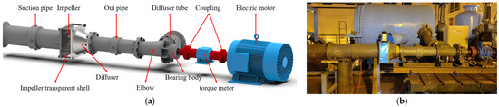 A 3D model of experimental pump is shown in Figure 3a. Prior to starting the experiment, the test pipeline was connected according to Figure 3b. The impeller was made of a copper alloy. The diffuser was made of stainless steel. The torque meter was zero-calibrated under no-load conditions before filling the pipeline with water to eliminate mechanical losses caused by bearings and sealing components. As the test pump is a mixed-flow pump, it is started by opening the valve. The direct current variable frequency motor was adjusted to the test speed, and once the operation stabilized, the valve opening was adjusted to control the flow rate. Data were collected to complete the hydraulic performance test.