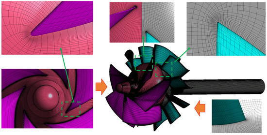 TurboGrid was used to generate hexahedral structured grids for the impeller and diffuser domain. Long straight pipe sections were added at the inlet of the impeller and the outlet of the diffuser. ICEM CFD was used for the hexahedral structured grid generation. The computational grids for hydraulic components are shown in Figure 4.