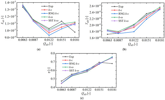 Comparison of CFD results with different turbulence models and experiment. (a) Energy efficiency; (b) torque coefficient; (c) efficiency.