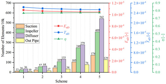 To ensure grid independence, five sets of grid schemes were generated by adjusting the grid density while maintaining the topology and the first layer height near the walls. The number of grid cells for each component and the corresponding calculation results are shown in Figure 6. In the figure, the abscissa shows the five schemes, the left vertical coordinate shows the number of meshes of different hydraulic components of each scheme, and the right coordinates are the energy coefficient EnD, torque coefficient TnD, and efficiency η. From the figure, it can be observed that as the grid was refined, the energy coefficient EnD, torque coefficient TnD, and efficiency η tended to stabilize. Scheme 4 and Scheme 5 yielded nearly identical results. However, to capture the finer flow field structures as much as possible, Scheme 5 was chosen for the final calculation. It consisted of a total of 12.54 million cells, with 1.74 million cells for the inlet pipe, 4.09 million cells for the impeller, 5.42 million cells for the diffuser, and 1.29 million cells for the outlet pipe.