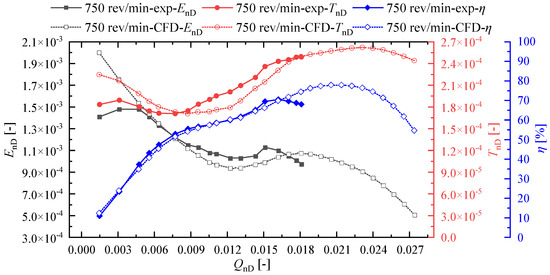 The numerical simulation results are non-dimensional and compared with the experimental data to validate the accuracy of the numerical simulation. The comparative results are shown in Figure 7. The abscissa shows the flow coefficient QnD, the left vertical coordinate shows the energy coefficient EnD, and the right vertical coordinates represent the torque coefficient TnD and efficiency η.