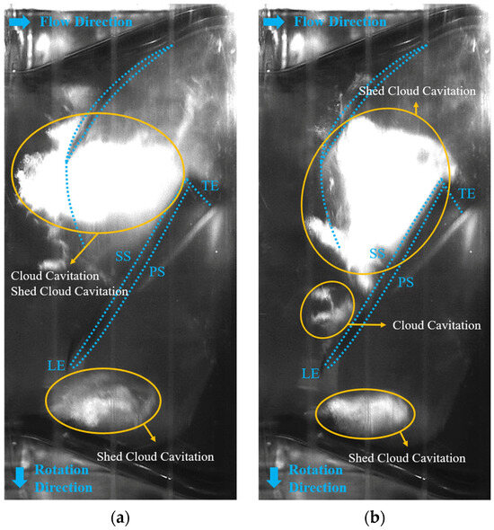 As shown in Figure 8a, in the critical cavitation stage of the near-valley condition, there are mainly vortex cavitation, cloud cavitation, vertical cavitation vortex, and other cavitation forms in the flow channel. LE and TE are the leading edge and trailing edge. SS is the suction surface and PS is the pressure surface. Cloud cavitation occurs at the suction side of the impeller blade near the leading edge. As the impeller rotates, grows, and gradually falls off, the shedding cloud cavitation gradually shifts downstream and is accompanied by the rotation of the cavitation vortex. The size of the hole between different flow channels is different. In the two adjacent channels, one channel is almost completely blocked by the hole, and the other channel is blocked by about 1/3 in the circumferential direction. At this time, the head of the test pump under this flow condition is about 3% lower than that under the initial condition. As shown in Figure 8b, in the critical cavitation stage of the near-peak conditions, there are mainly vortex cavitation, tip leakage vortex, cloud cavitation, vertical cavitation vortex, and other cavitation forms in the flow channel. Cloud cavitation occurs at the position where the suction surface of the impeller blade is close to the inlet edge. As the impeller rotates, the shedding cloud cavitation gradually shifts downstream and is accompanied by the rotation of the cavitation vortex. From the experimental observation, it is found that with the development of cavitation, the cavity size in the flow channel in the critical cavitation stage increases continuously. However, the hole size between different channels is still very different. In the two adjacent channels, one channel is almost completely blocked by holes, and the other channel is about half blocked in the circumferential direction. At this time, the head of the test pump under this flow condition is 3% lower than that under the initial condition.