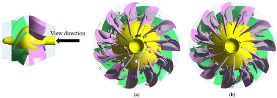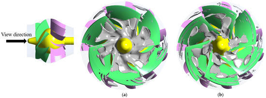 From Figure 9, compared to the peak condition, it can be observed that the valley operating condition exhibits a higher intensity of vortex cores near the hub region within the impeller. The intensity of the vortex cores near the shroud region in valley condition is higher. This means that in valley conditions, there is a large amount of energy dissipation in the impeller, resulting in a decrease in pump performance.