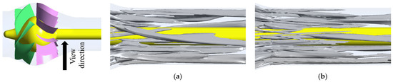 The intensity of turbulent dissipation is closely related to the intensity of vortex structures. The Ω method [30] is used to extract the internal vortex structures within the pump under valley and peak flow conditions. Figure 9, Figure 10 and Figure 11 show the distribution of vortex cores within the impeller, diffuser, and out pipe, respectively.