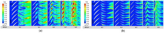 Figure 12 shows the distribution of turbulent kinetic energy within the pump under valley and peak flow conditions. The figure is based on a blade-to-blade view at different circumferential heights (from hub to shroud, Span = 0.1, 0.3, 0.5, 0.7, 0.9) within the impeller and diffuser. From the figure, it can be observed that the regions with high turbulent kinetic energy within the impeller region are mainly located near the shroud under both valley and peak flow conditions. Within the diffuser region, there are regions with high turbulent kinetic energy at different circumferential heights, but the distribution patterns vary. As the circumferential height increases, the turbulent kinetic energy at the inlet of the diffuser increases, while it decreases at the outlet.