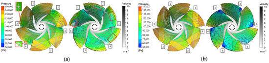Pressure and streamline distribution of impeller blades under valley and peak conditions. (a) Valley condition; (b) peak condition.