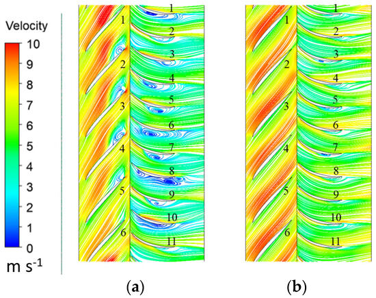 To further analyze the flow state in different flow channels under valley and peak conditions, the streamline distribution at a height of 0.5 in the impeller and guide vane basin was extracted (as shown in Figure 14). It can be seen from Figure 14a that there are large-scale backflow vortices and flow separation in the impeller and diffuser under the valley condition. The flow distribution in the impeller mainly appears at the trailing edge of the suction surface, the scale of the vortex structure in the six flow channels is not evenly distributed, and the vortex structure in each flow channel is quite different. Similarly, the scale of the vortex structure in the 11 flow channels in the diffuser is not evenly distributed, and the vortex structure in each flow channel is quite different. The vortex structure scale on the back of the sixth, eighth and tenth blades of the diffuser is more obvious. The vortex structure on the back of the eighth blade is particularly special, and there are three groups of vortices, which disturb each other. The vortex in the diffuser channel, especially the vortex at the inlet of the diffuser, also has an obvious influence on the flow in the impeller. From Figure 14b, it can be seen that under the peak condition, the streamlines of the impeller and the diffuser at the spanwise of 0.5 are smooth and uniform, and the flow is regular. Only a small backflow vortex appears on the back of the diffuser.