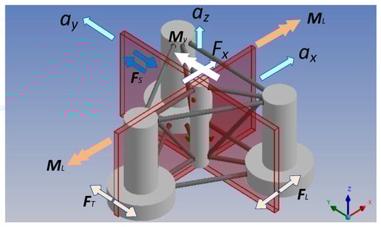 According to the features of the OC4 semi-submersible platform, the following characteristic responses are chosen, whose extremes are achieved using design waves (see Figure 2). They are the accelerations in three directions (, , and ), the split force between two outer columns (), the split force between one outer column and the other two outer columns (), the shear force between one outer column and the other two columns (), and the torsion moment between one outer column and the other two columns (). The vertical bending moments are less likely to develop significantly because the semi-submersible platform is not as long as ships. Therefore, the vertical bending moment is not considered in the present study.