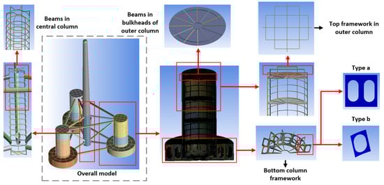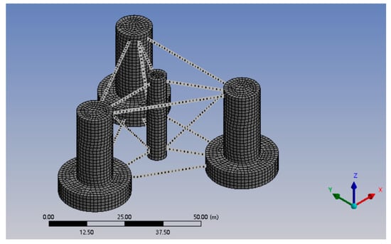 The structural components of the semi-submersible platform are shown in Figure 5. The finite element model of the semi-submersible platform is constructed in ANSYS Workbench 2021 R1. The mesh condition of the outer column is also shown in the figure. The finite element model consists of shell elements and beam elements. The outer surfaces of the columns, bulkheads, braces, and strong frames are modelled by shell elements. Circumferential and vertical beams stiffen the four columns. Each outer column is divided by several horizontal bulkheads, stiffened by beams. Strong frames support the bottom of the outer column. The shell element models the tower, and the nacelle, rotor, and blades are modelled as mass elements. The mesh size of the structural model is about 0.2 m. The mesh size is smaller than the one usually used in the global analyses of ships and offshore structures, which is the stiffener spacing for the coarse mesh model.