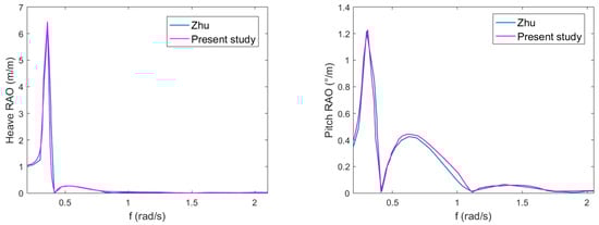 The hydrodynamic analyses are carried out using ANSYS AQWA 2021 R1. Panels model the columns, and Morison elements model the connections between the columns. The hydrodynamic models and the coordinates are shown in Figure 3. The mesh convergence is checked before the model is applied. The size of the panels is 1.2 m, and the size of the Morison elements is 1.2 m. The numerical model is validated by comparing it with the results of an existing numerical study. The heave and pitch predicted by the present study and Zhu [] are shown in Figure 4. Good agreement is achieved, indicating that the hydrodynamic analysis model is reliable.