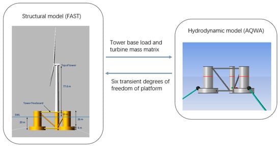 The coupling framework based on FAST and ANSYS AQWA, denoted as F2A, for dynamic analysis of FOWTs developed by Yang et al. [] is used in the time-domain simulation. The coupling is achieved by modifying the source codes of FAST and the dynamic link library (DLL) of AQWA. The coupling framework has been validated by comparing it with OpenFAST, and some advantages of the coupling framework have been noticed []. The floating offshore wind turbine model in a time-domain simulation is shown in Figure 6. The dynamic model of the turbine coupling system is established based on FAST, and the hydrodynamic model is calculated by combining potential flow theory with the Morison equation. The NREL 5-MW reference wind turbine is used in the simulation, and the mooring system is the same as those introduced in []. The Kaimal wind and the P-M wave spectra are chosen in the simulation. The turbulent intensity is 12%. The time step of the wind turbine dynamic simulation is 0.005 s, and the time step of the hydrodynamic simulation is 0.1 s. For each simulation, the analysis time is 800 s with a transient start-up time of 200 s.