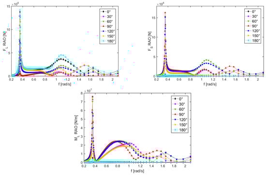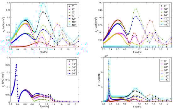 The are shown in Figure 8. For the vertical acceleration , the wave angles from 0° to 60° with an interval of 15° are considered due to the triangular shape of the platform. For the other , the wave angles from 0° to 180° with an interval of 30° are considered due to the symmetry of the platform. The wave direction along the x-axis is 0°. The regular wave period ranges from 3 to 30 s with an interval of 0.2 s between 3 and 20 s and an interval of 2 s between 20 and 30 s.