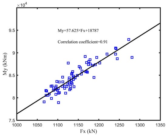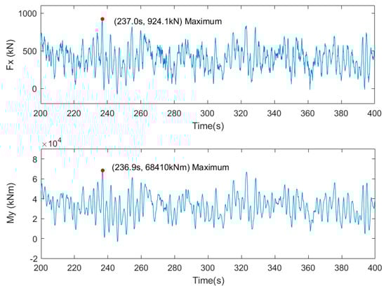 According to the procedure of the modified ECM, the environmental condition that leads to the largest is , and , where is the mean value wind speed at the height of the hub. The environmental condition is found in an environmental contour with a return period of 0.0119 years. The number of time-domain simulations for this environmental condition is 83, which satisfies the criterion proposed in []. The time history of the tower base and in one time-domain simulation is shown in Figure 9.