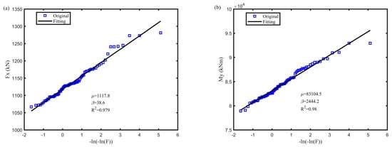 In the present study, the most probable extreme values extrapolated for the return period of 50 years based on the two Gumbel distributions are applied to the finite element model. To illustrate the proposed method, the extreme values are only obtained when the wind direction is 0°. The effects of the wind direction on the load effects have been checked in some studies [,]. Their results indicate that the impact of wind direction on the extreme load effects of a 10 MW FOWT is insignificant. The effect is not clear for the FOWT investigated in the present study. The extreme values may vary significantly with direction. Further studies may be carried out to examine the effect of the wind direction on the extreme values of loads and the corresponding load effects.