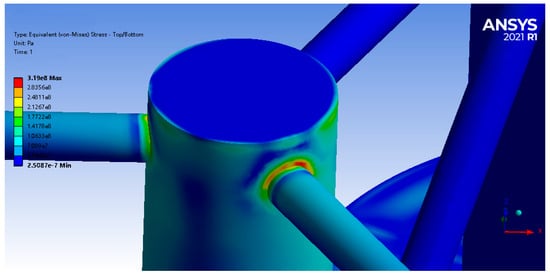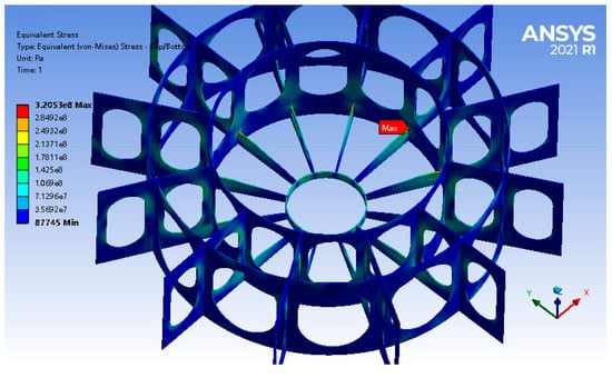 The maximum von Mises stress and its location for each load case are listed in Table 4. It can be seen that the maximum von Mises stress appears at different locations for different load cases. The frame at the bottom of the outer column is the critical location for five load cases. The stress distribution in the frame for load case 7 is shown in Figure 12. The maximum stress is located at the toe of the bracket. The bracket toe is also the maximum stress location for the other four load cases. High stresses appear at several bracket toes. It indicates that the frame design is essential for structural strength. To reduce the maximum stress occurring at the bracket toe, the bracket may be replaced by a continuous web frame.