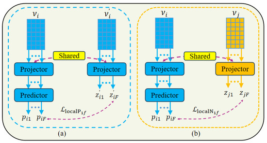 The notation “stopgrad” indicates that gradient computation is paused, considering as a constant value. Here, represents the norm. Similarly, let denote the negative cosine similarity between and , which can be computed by formula (7).