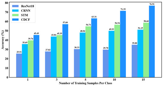 As depicted in Figure 6, CDCF consistently achieves the highest recognition results across all 5-shot situations. With an increasing number of shots for each method, the recognition accuracy continues to improve, and the performance gap between CDCF and the other three traditional UATR methods gradually widens. Particularly, when there are 15 samples per category, CDCF attains an impressive accuracy of 76.91%. Comparing CDCF with the second-best model, CDCF demonstrates improvements of 5.73%, 11.74%, 8.6%, 14.85%, and 18.31% in 1-shot, 3-shot, 5-shot, 10-shot, and 15-shot scenarios, respectively. In contrast, the highest recognition rate achieved by the other three models across all shot situations only reaches 58.60%. Among these three traditional UATR methods, Resnet18 exhibits modest performance improvements as the number of shots increases, while demonstrating notable performance disparities compared to the other two models. When the number of shots increases from one to five for CRNN and STM, their performance experiences rapid enhancement; however, further increases in the number of shots yield minimal performance improvements for both models.