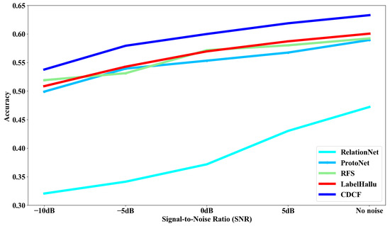 In UATR, noise interference is an inevitable factor when collecting data. Even the two datasets utilized in our experiments do not consist solely of clean ship-radiated noise; rather, they exhibit a high signal-to-noise ratio (SNR). Evaluating the model’s ability to effectively recognize targets in a noisy environment serves as a measure of its robustness. Hence, we introduce Gaussian white noise with different SNRs to the test data, aiming to assess the model’s anti-noise performance. All models are tested under 5-shot conditions, and the experimental results are illustrated in Figure 7.