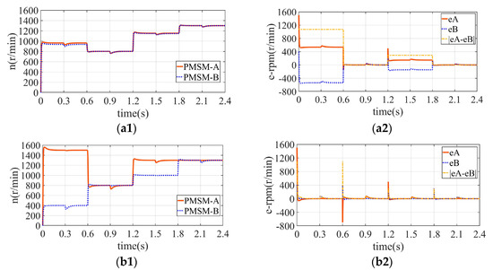 Under the same conditions, PMSM-A and PMSM-B were initiated with given speed commands of 1500 r/min and 400 r/min, respectively. At 0.6 s, they were both simultaneously switched to 800 r/min. Then, at 1.2 s, they were respectively switched to 1300 r/min and 1000 r/min at the same time. Finally, at 1.8 s, they were both simultaneously switched to 1300 r/min. At 0.3 s, 0.9 s, 1.5 s, and 2.1 s, a sudden load disturbance was applied to each motor.
