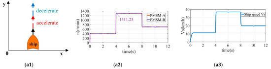 In response to the actual navigation requirements of the designed ship, a simulation analysis of the VEDC-CC strategy was conducted. The simulation results are presented in Figure 6. The dual-PMSM will be referred to as PMSM-A and PMSM-B, respectively, in this simulation study.