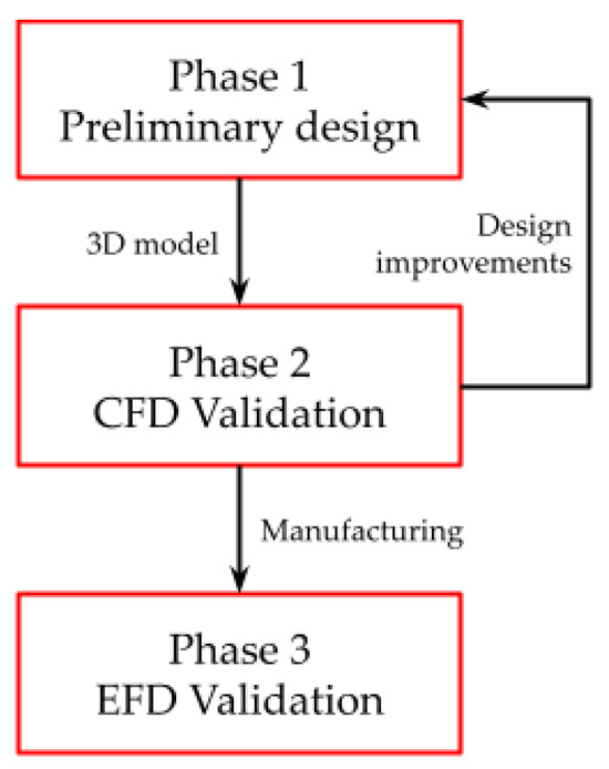 The USV design process was based on a three-phase methodology (Figure 1). Firstly, we defined a primary geometry using literature and technical reviews, aiming to satisfy all the requirements and mandatory design conditions. Secondly, the defined geometry was analysed and validated using a computational numerical hydrodynamics simulation (computational fluid dynamics, CFD). Finally, the hull geometry was manufactured and experimentally validated in a calm water towing tank facility.