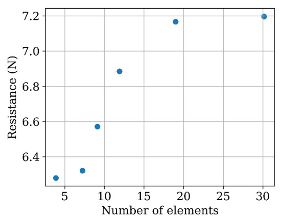 The CFD analysis of the unmanned marine vehicle hull was performed using a Froude number of 0.316 and a Reynolds number of 1.14 × 106 using ANSYS CFX software, which has been verified in the past for similar geometries. The water and air flows around the hull were simulated by solving the two-phase and free surface problems using the VOF (volume of fluid) method. A steady-state analysis was performed, using the RANS method, with a k-w SST turbulence model. The advection scheme and turbulence value were set to a high resolution and coupled with the volume fraction. A mesh with hexahedral and tetrahedral elements was generated using linear elements with zero degrees of freedom since the expected sinkage and trim were very small. Moreover, an inflation strategy was applied near the hull’s surface to calculate the boundary layer. The boundary layer was chosen to obtain a more accurate resistance value via the better modeling of the frictional resistance. In the turbulence model used, the treatment of the near-wall flow is highly dependent on the y+ parameter. To avoid the use of wall functions in modeling the boundary layer, this parameter must be equal to or less than 1, so y+ = 1 was set as the target, eliminating the need for wall functions. The boundary conditions, the multiphase problem characteristics, the convergence criteria, and the number of partitions for the calculation were defined. For the design speed, a grid performance test was conducted for which a total of six meshes were tested with different numbers of elements (Figure 4).
