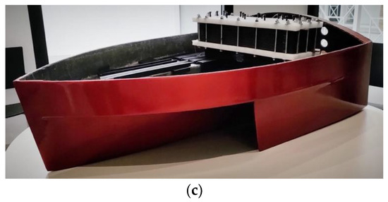 USV hull manufactured with FGF technology. (a) Details of the 3D printing process; (b) details of the double layer that forms the hull; (c) finished hull in the first stage of power plant integration.