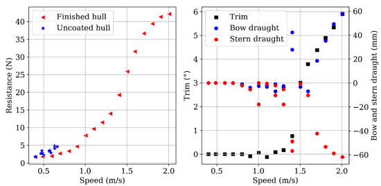 The hydrodynamic resistance, the ship trim angle, and the bow and stern draft were measured in the experiments. The results are shown in Figure 9. The experiments with the optimized hull focused on the stability of its navigation. The speed was increased until the outrigger hulls generated a wave train that interfered with the main hull’s leading edge, compromising the stability of the trimaran at speeds above 2 m/s. Figure 9 incorporates experimental data obtained from tests conducted on the uncoated hull (blue stars), facilitating a comparison of the coating’s advantages and illustrating the hydrodynamic improvement achieved by the ship due to the smoother surface created by the finishing coating.