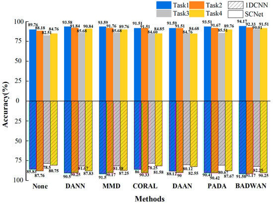 Figure 4 illustrates the comparative results of the diagnostic accuracy for various methods obtained through experiments in four transfer scenarios. In this context, “None” represents the outcome of cross-condition diagnosis without employing the transfer learning method, utilizing only 1DCNN or SCNet for diagnosis across different operating conditions. 1DCNN obtained 85.83%, 87.76%, 78.5% and 80.75% for each of the four tasks, while SCNet achieved 89.76%, 88.18%, 82.51% and 84.76%. Notably, SCNet consistently demonstrated a higher diagnostic accuracy than 1DCNN across all four transfer task scenarios. This superiority can be attributed to SCNet’s structure, which features a more expansive sensing field, enabling it to effectively extract diverse sample features and consequently enhance the diagnostic accuracy. And regardless of whether 1DCNN or SCNet is utilized as the baseline model, the integration with the transfer learning method significantly enhances the diagnostic accuracy. This observation supports the viability of applying the transfer learning method to the cross-condition fault diagnosis of marine engines. In particular, the diagnostic accuracies achieved by the BADWAN surpass 90% across four tasks, yielding results of 94.17%, 92.33%, 90.01% and 91.51%, respectively. These figures demonstrate a substantial improvement, surpassing those of the 1DCNN network model by 8.34%, 4.57%, 11.51% and 10.76%. This robust performance underscores the viability of implementing the proposed method in cross-operating condition fault diagnoses for marine engines, showcasing its effectiveness in enhancing the diagnostic model’s performance under varying operating conditions. Additionally, Figure 4 reveals that the diagnostic accuracy of SCNet, serving as the baseline model, surpasses that of 1DCNN, irrespective of the adoption of the transfer learning method. This finding validates the effectiveness of incorporating SCNet.