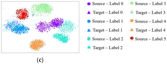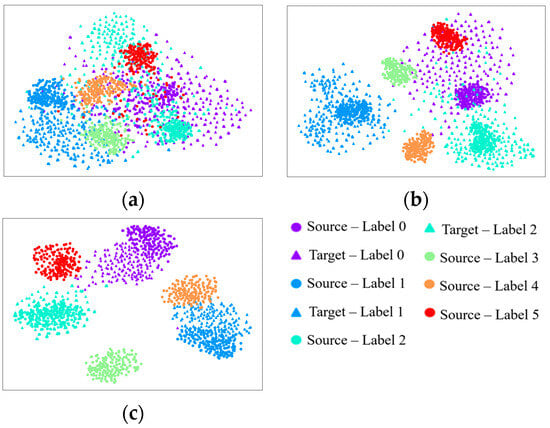 Regrettably, in practice, acquiring an ample quantity of labeled samples proves to be a time-consuming and challenging endeavor. Frequently, the predominant portion of collectible samples consists of raw, unlabeled data [,]. Moreover, owing to the intricate and fluctuating nature of marine engine operating conditions, the gathered monitoring samples frequently exhibit diverse probability distributions. In the context of a classification task involving samples with different probability distributions, existing research employs Unsupervised Domain Adaptation (UDA) [] to transfer valuable knowledge learned from labeled source domain samples to unlabeled target domain samples. This process aims to achieve classification in unknown target domains. Li et al. [] achieved cross-domain fault diagnosis by minimizing the maximum mean difference (MMD) between domains. Liu et al. [] employed a Domain Adversarial Neural Network (DANN) model, which integrates an adversarial mechanism to extract domain-invariant features, for the execution of the bearing fault diagnosis task under varying loads. Chen et al. [] employed Dynamic Adversarial Adaptation Networks (DAANs) to achieve the joint distribution alignment of marginal and conditional distributions between domains. They complemented this approach with streaming regularization to further uncover latent internal information. This effort was aimed at enhancing the model’s adaptability for fault diagnosis in rotating machinery under diverse operating conditions. The majority of domain adaptive transfer learning methods discussed in the preceding studies accomplish the transfer of domain knowledge by narrowing the gap between domains or extracting domain-invariant features through adversarial techniques. This approach holds significant utility in diagnostic tasks characterized by variations in sample distributions []. However, it is crucial to note that the prerequisite for the UDA task is the consistency between the label spaces of the source and target domains.