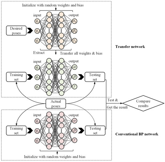 - Step 3: Obtain the source domain and target domain datasets. For the selected two types of configurations, nominal actuated joint variables are calculated by substituting into Equation (2) and used as inputs for both the source and target networks. The desired poses and the actual poses obtained in steps 1 and 2 are taken as the outputs of the source and target networks, respectively.