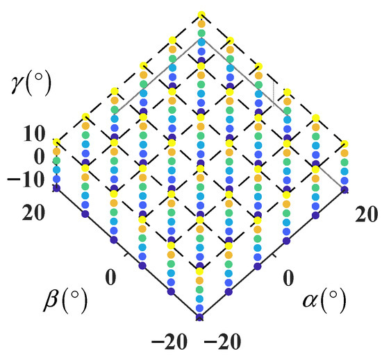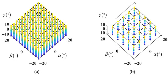 - Step 1: Select source domain configurations. The rotational angle ranges of the moving platform around the x, y, and z axes are −20° to 20°, −20° to 20°, and −10° to 10°, respectively. Considering the typical scenario in transfer learning, where the source domain often has a much larger sample size than the target domain, 1331 desired end-effector poses within the workspace are uniformly selected as the source domain configurations (as shown in Figure 5a).