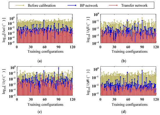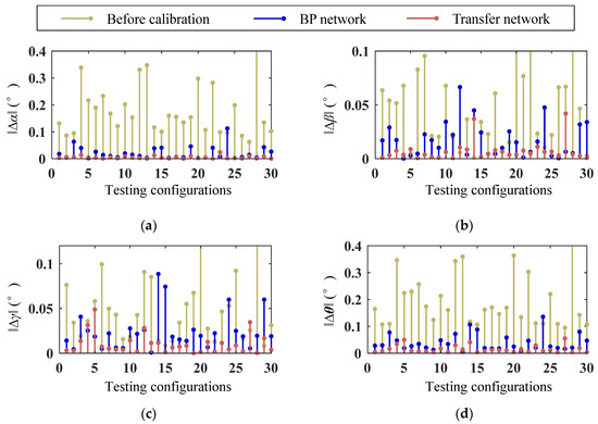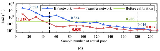 - . In this range, considering each evaluation index, transfer networks continue to demonstrate certain performance advantages over the BP networks. The average for transfer networks is 0.364°, smaller than the BP networks’ 0.038°. Furthermore, as the sample size increases, the transfer network achieves improved absolute prediction accuracy, notably surpassing the accuracy before calibration. This indicates that not only can the transfer network meet the practical calibration application requirements, but it also exhibits stronger predictive capabilities than the conventional BP network. Thus, transfer learning is the most appropriate approach within this range.