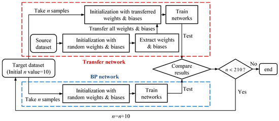 - . In this range, it can be observed that the lines representing the transfer network and the BP network in the figure closely overlap, indicating no significant difference in their performance. The performance improvement effect of the transfer learning method becomes weak or even non-existent. Therefore, establishing and training a relatively simple BP network is a better choice.